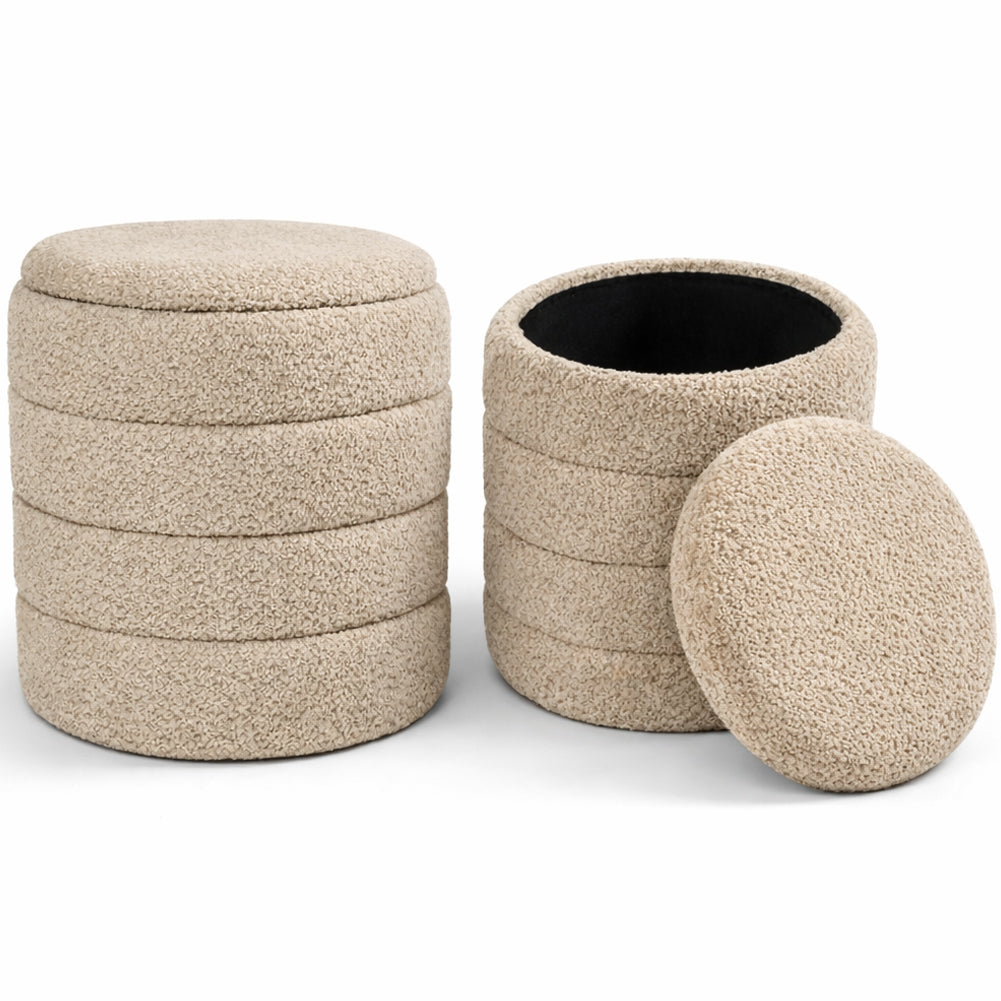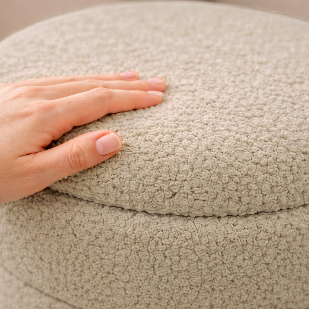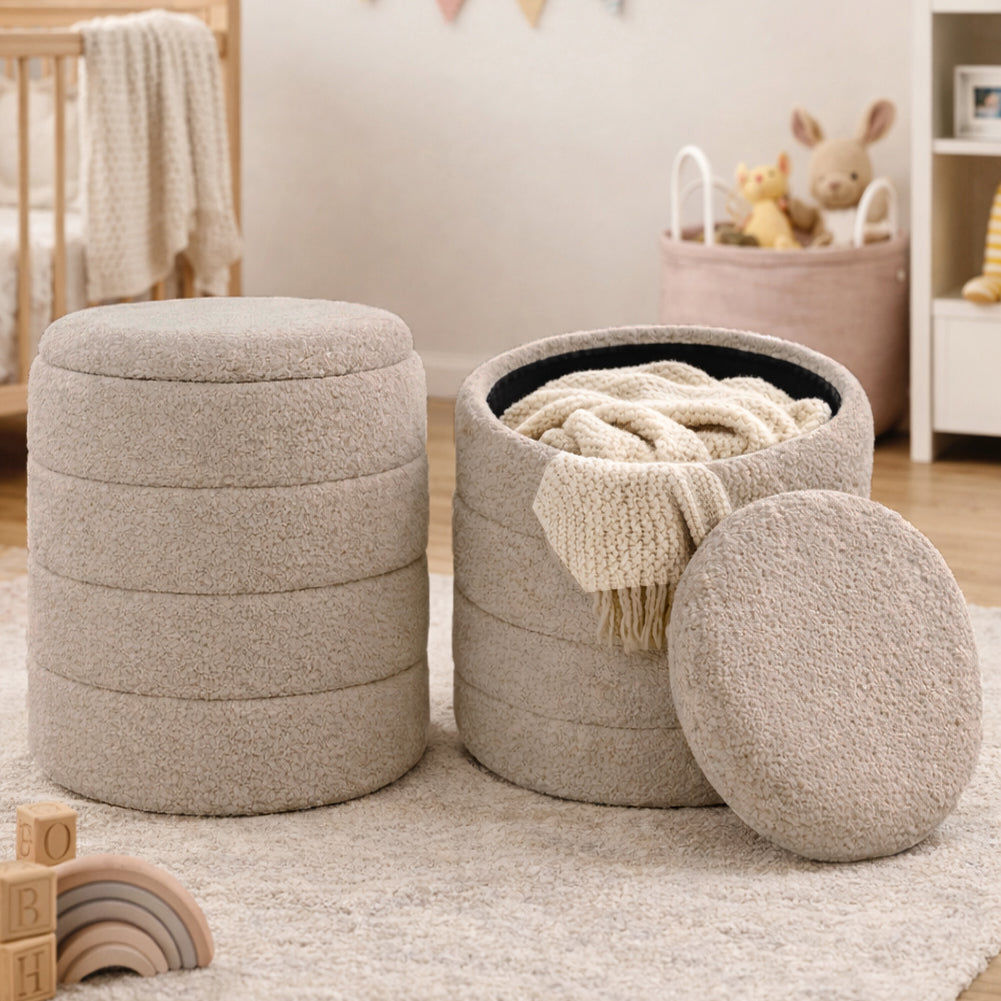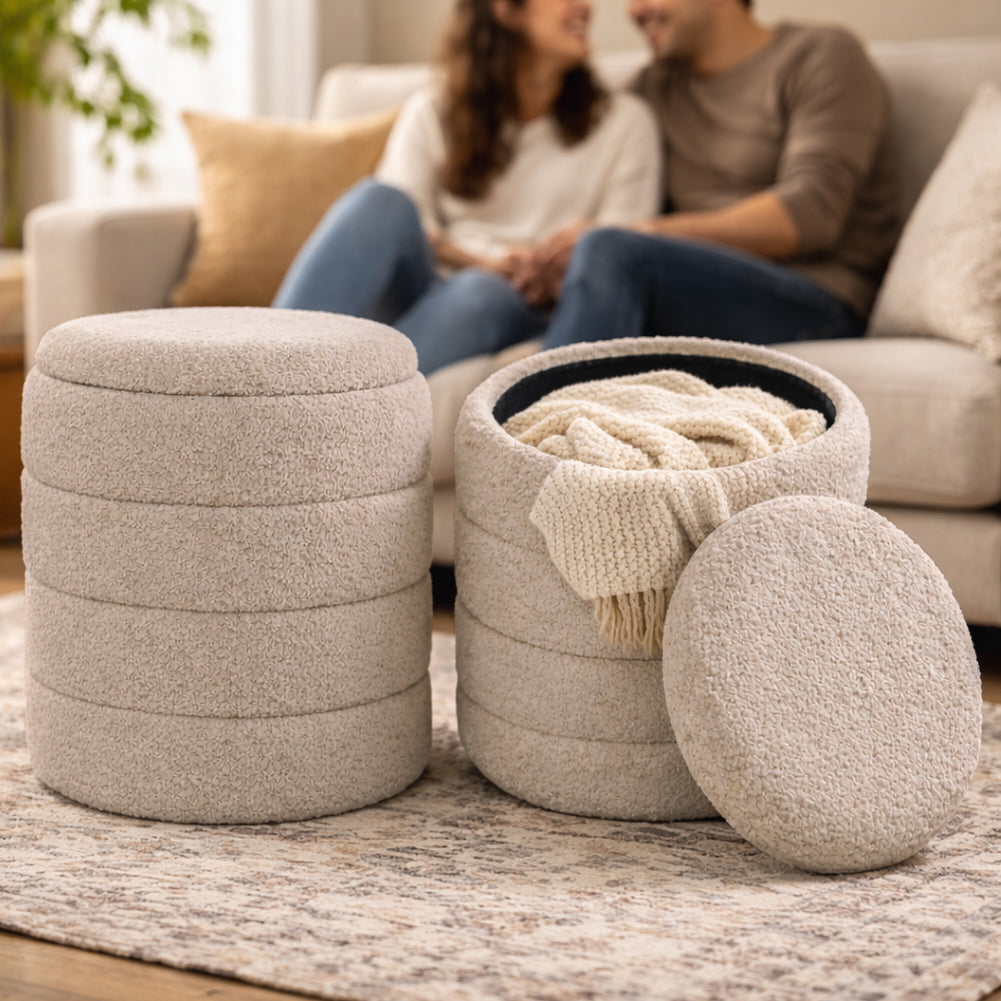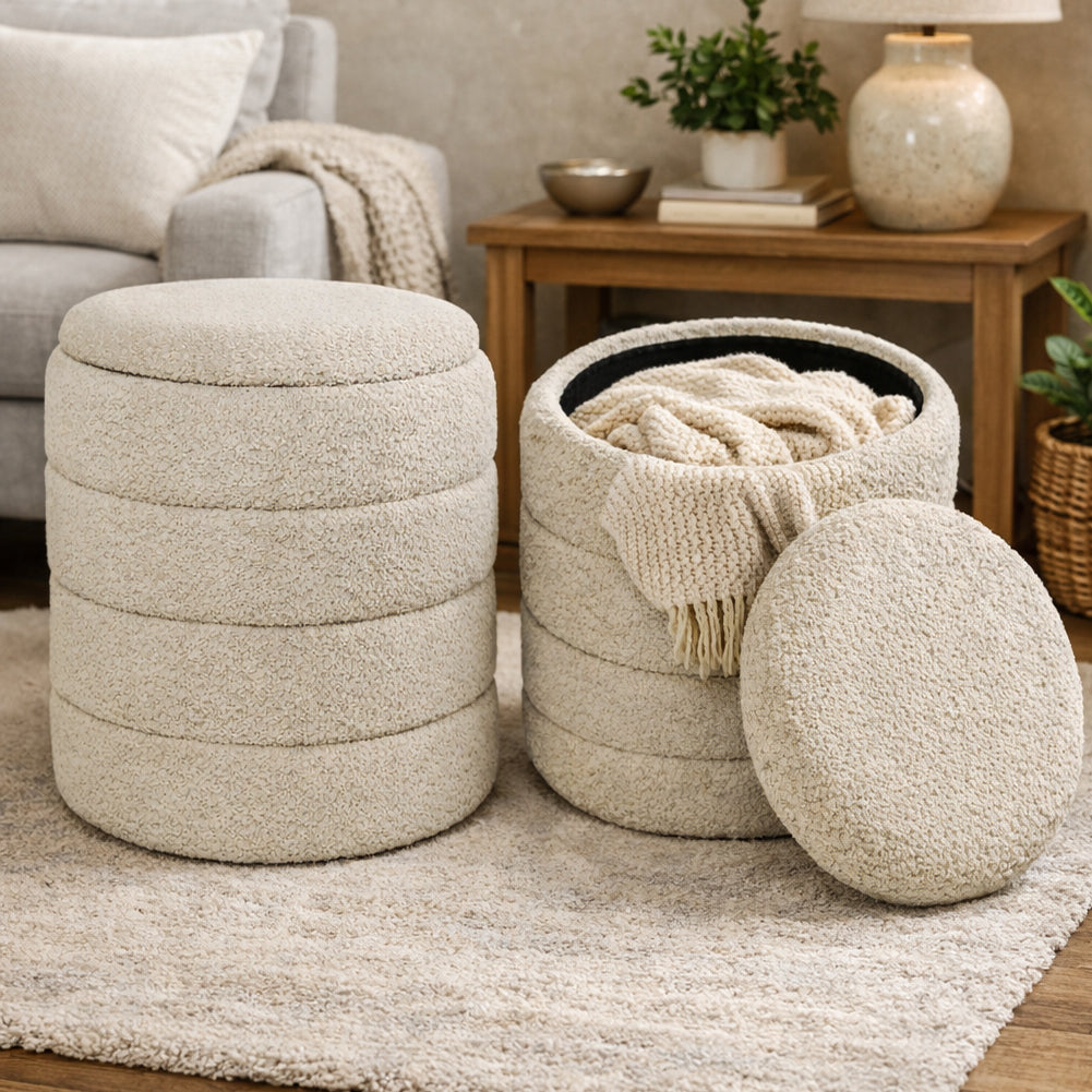 Set di pouf contenitore dal design moderno e raffinato, caratterizzati da una morbida texture effetto bouclé che dona calore e stile a qualsiasi ambiente.