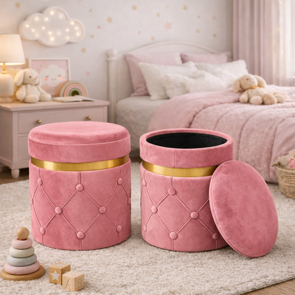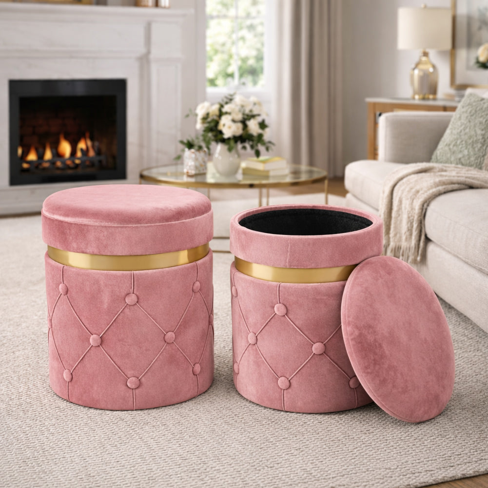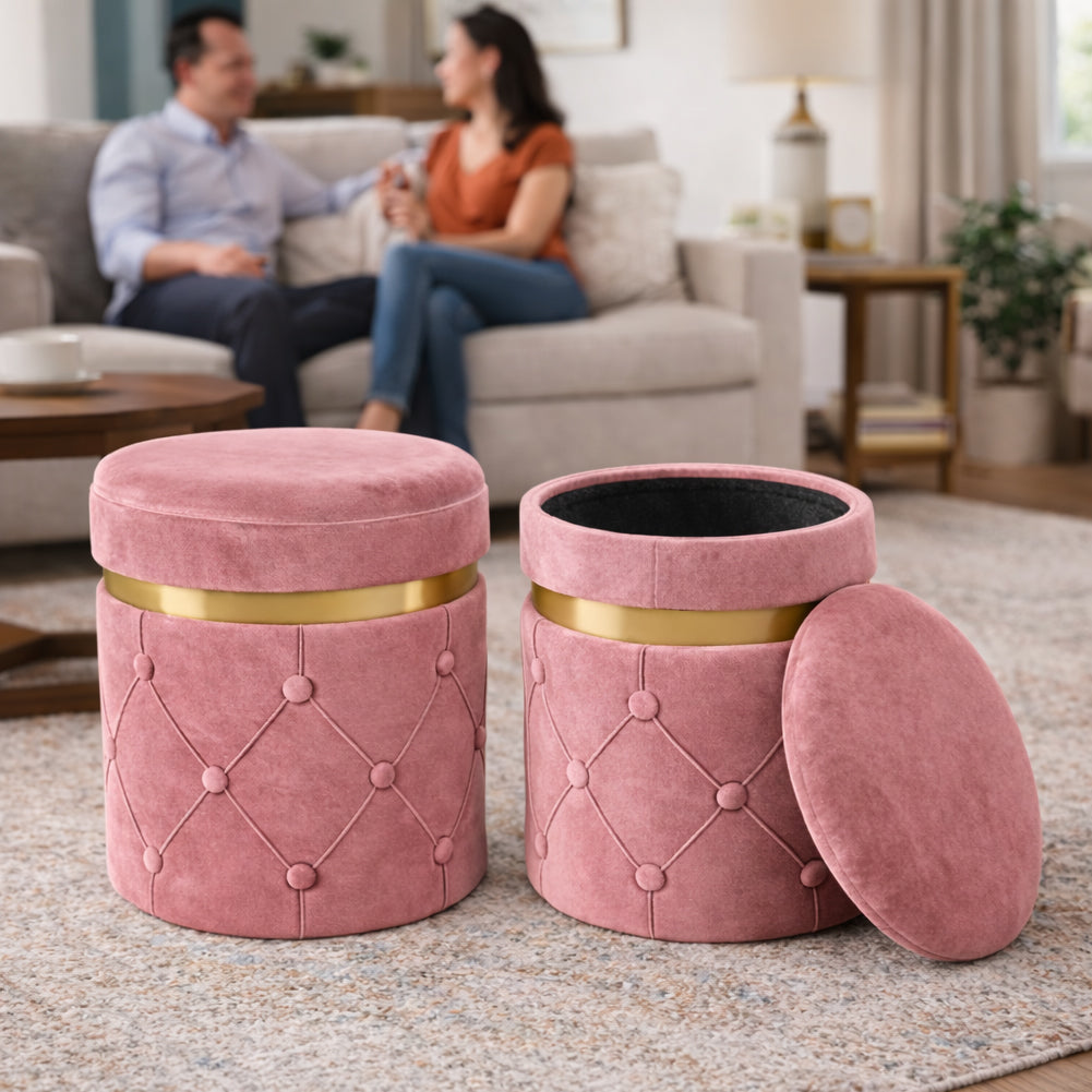 1 x Set 2 Pouf Contenitori Rosa in Velluto con Design Trapuntato 38x44cm 31x38cm