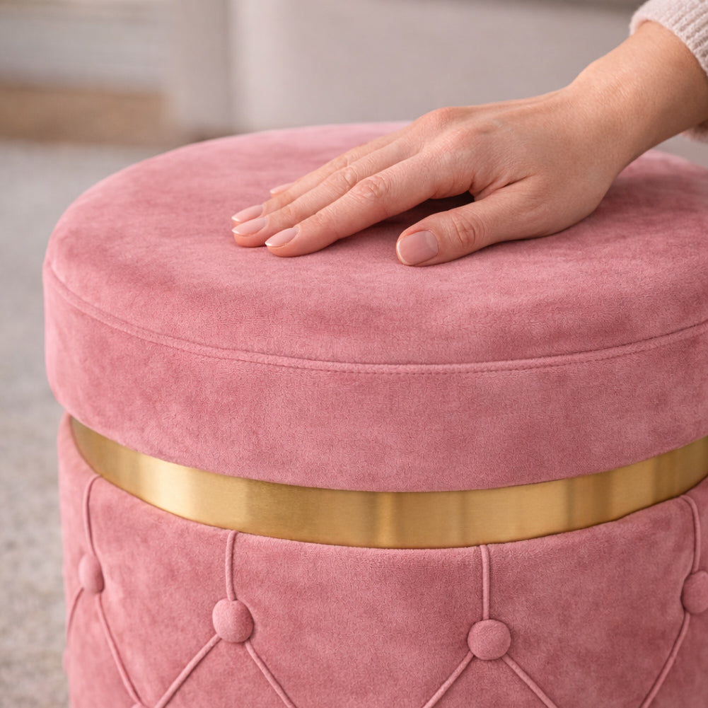 Set di pouf contenitori dal design raffinato con lavorazione trapuntata effetto capitonné e fascia decorativa oro che dona un tocco glamour e moderno.