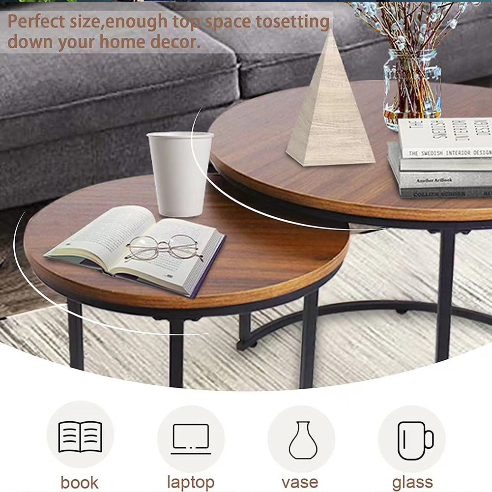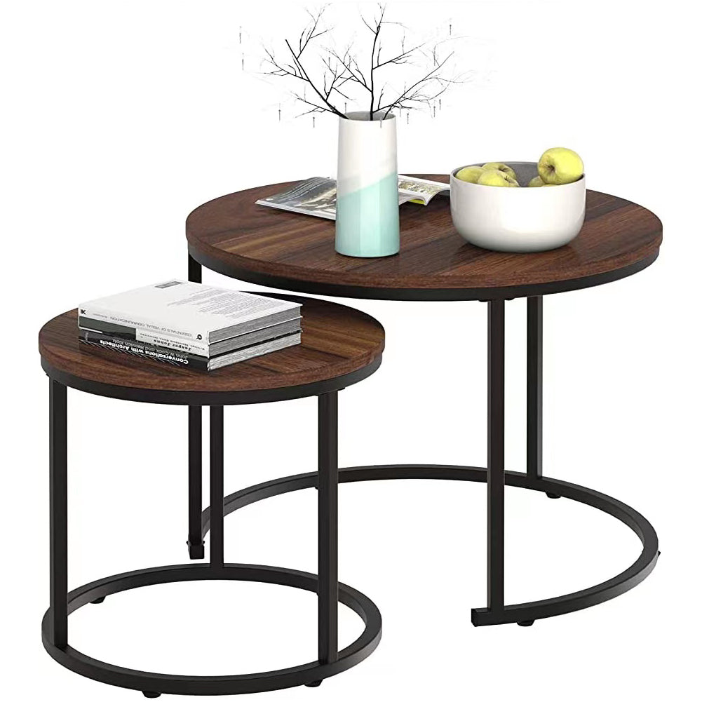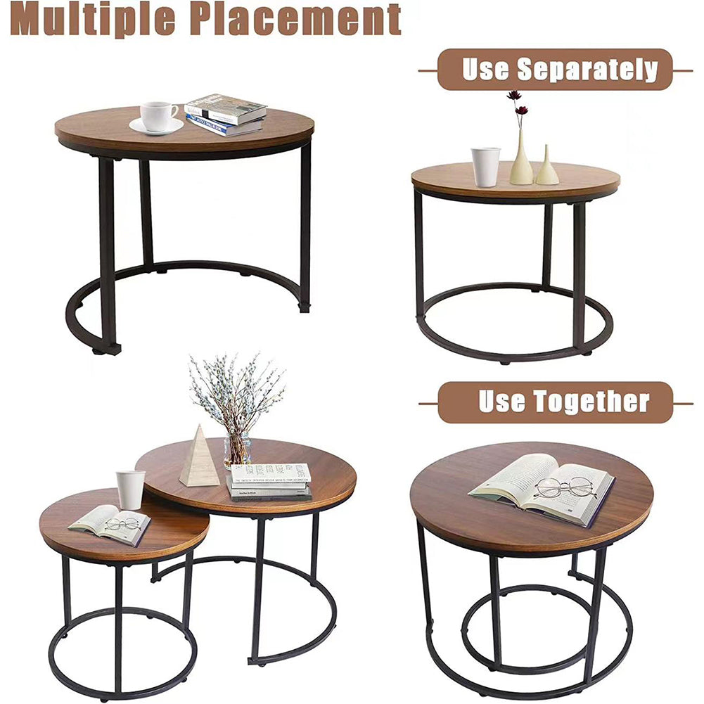 1 x Set 2 Tavolini a Incastro Salvaspazio Noce Struttura in Metallo Nero e Piano MDF