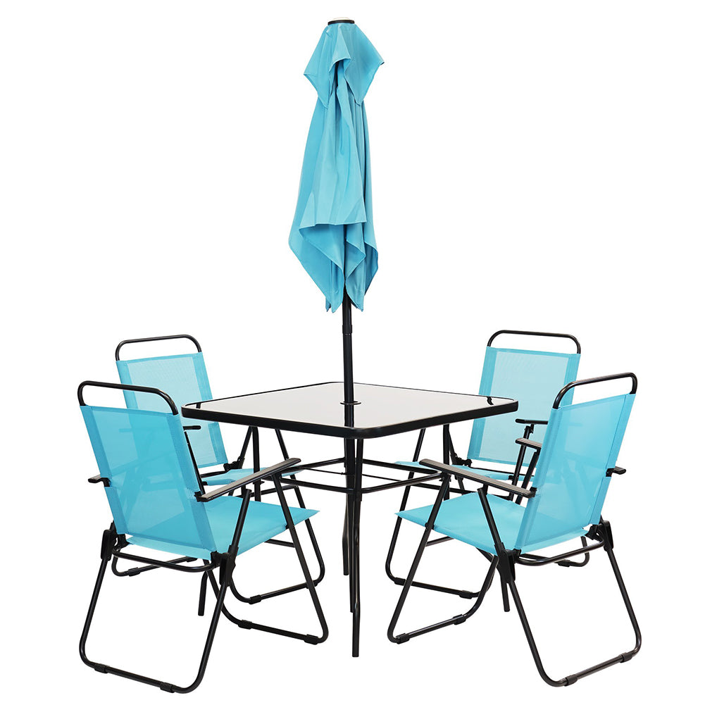 Set da Pranzo 6 Pezzi per Giardino con Ombrellone e 4 Sedie Pieghevoli Celeste