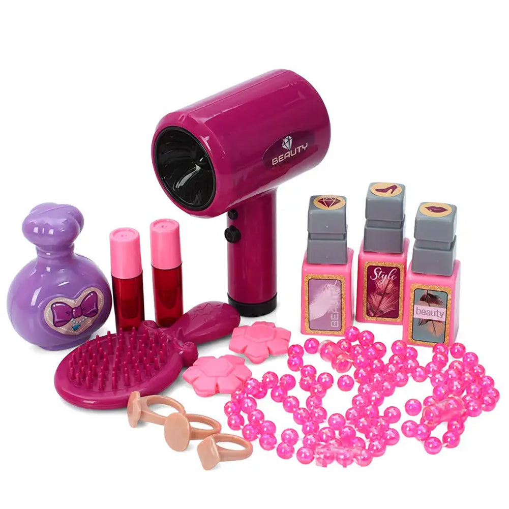 Un vero salone di bellezza portatile per piccole stiliste! La stazione include tutto il necessario per ricreare un’esperienza da make-up artist: specchio, phon, pettine, flaconi di trucco, anelli, collane e tanti altri accessori per un divertimento creativo e senza limiti.