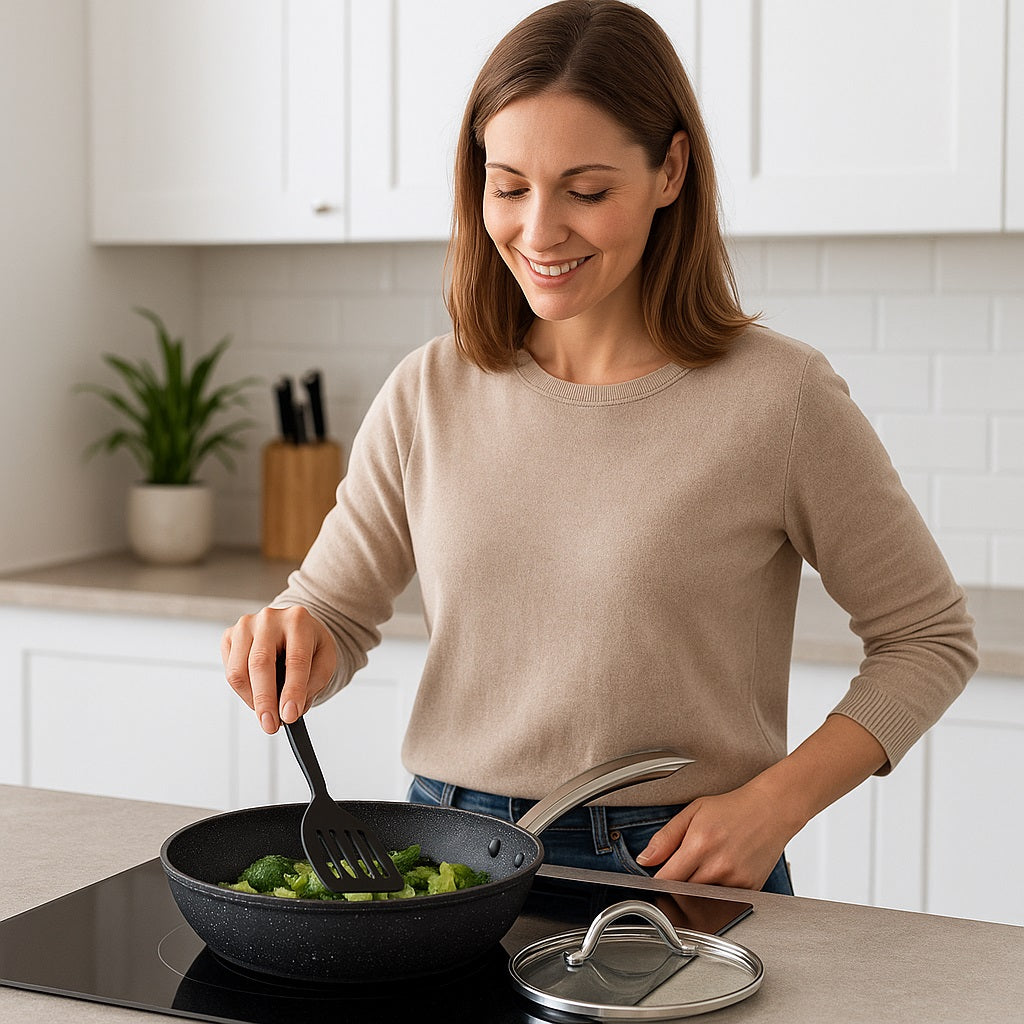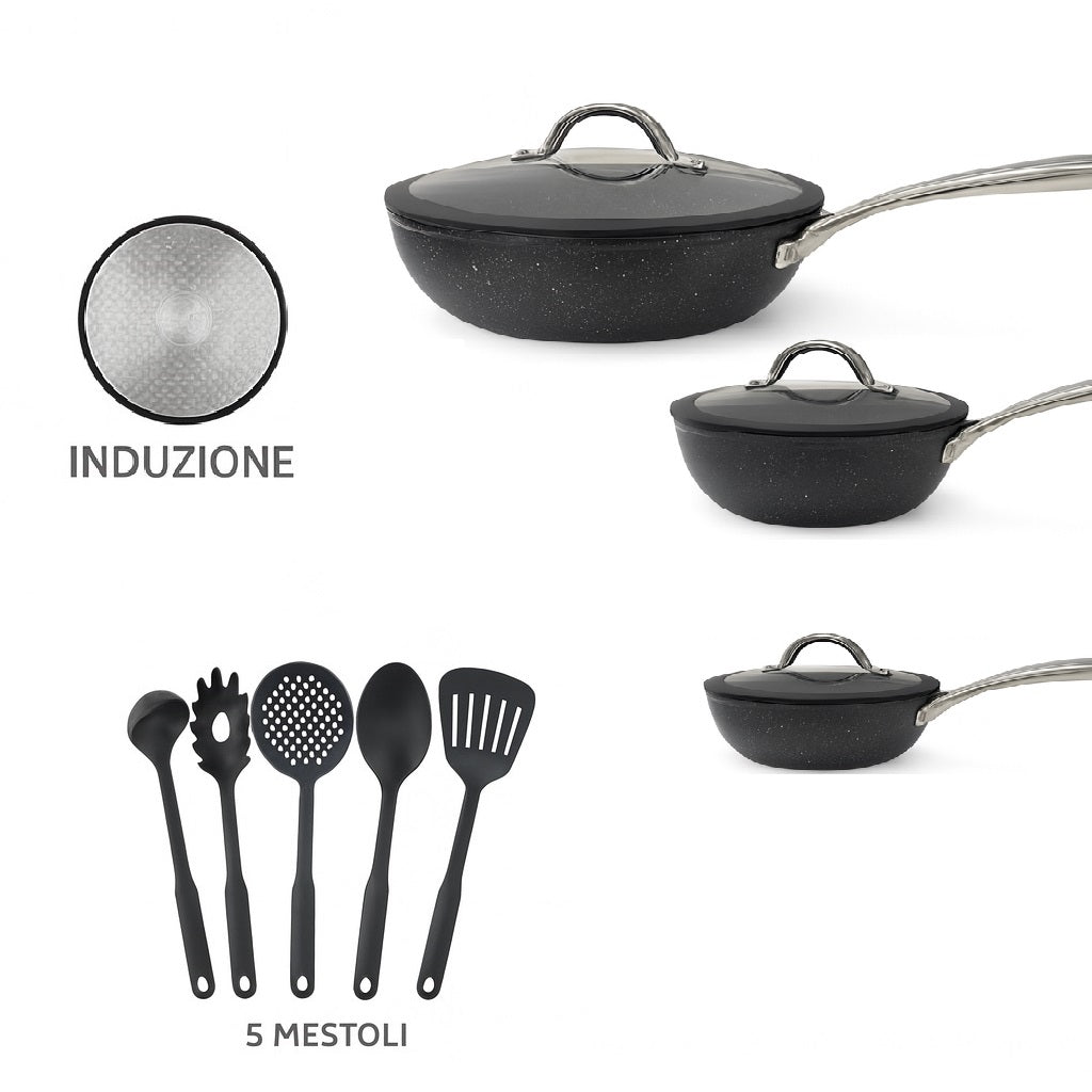 Set Padelle Induzione Pietra Antiaderenti 20/24/28 cm con Coperchi e 5mestoli Nero