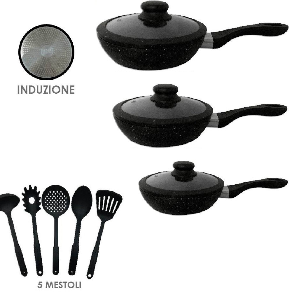 Kit composto da 3 Padelle Alte Pietra Nero 20 / 24 / 28 cm complete di Coperchio in Vetro Temperato