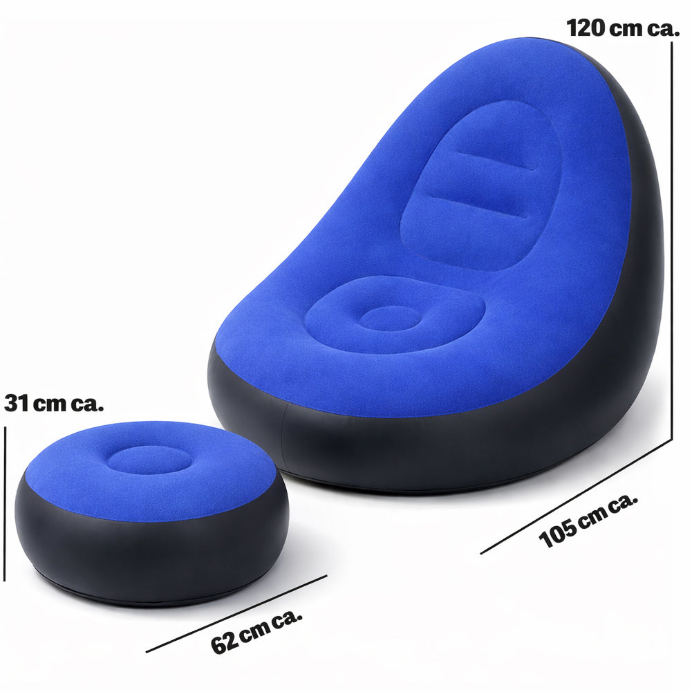 Poltrona gonfiabile con pouf coordinato progettata per offrire un comfort avvolgente e stabile.