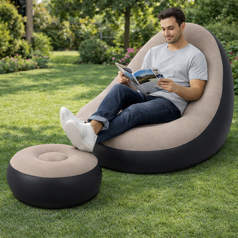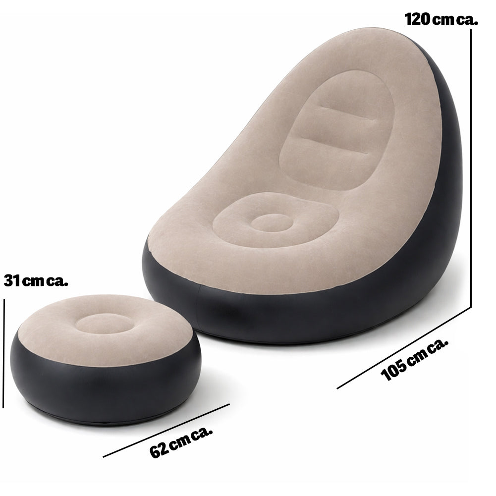 Poltrona gonfiabile con pouf coordinato progettata per offrire un comfort avvolgente e stabile.