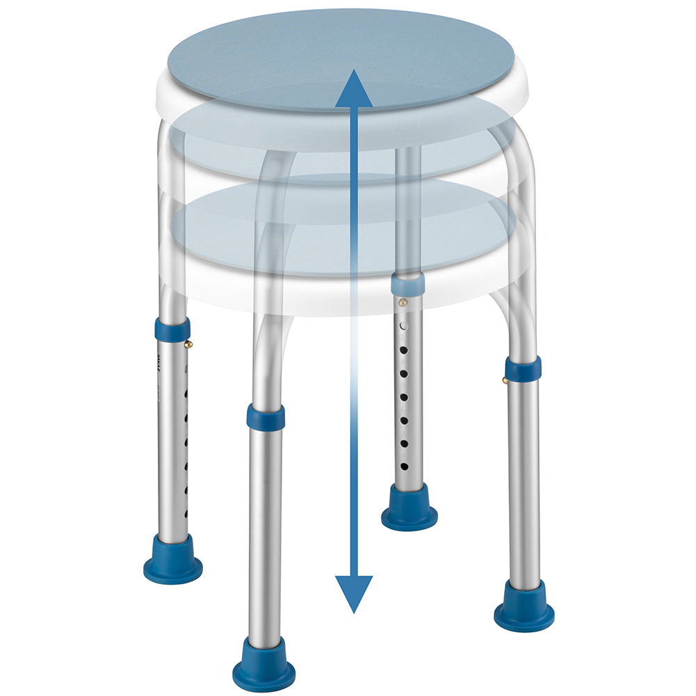 Sedile da doccia regolabile in altezza con seduta antiscivolo dotata di fori per il deflusso dell’acqua.