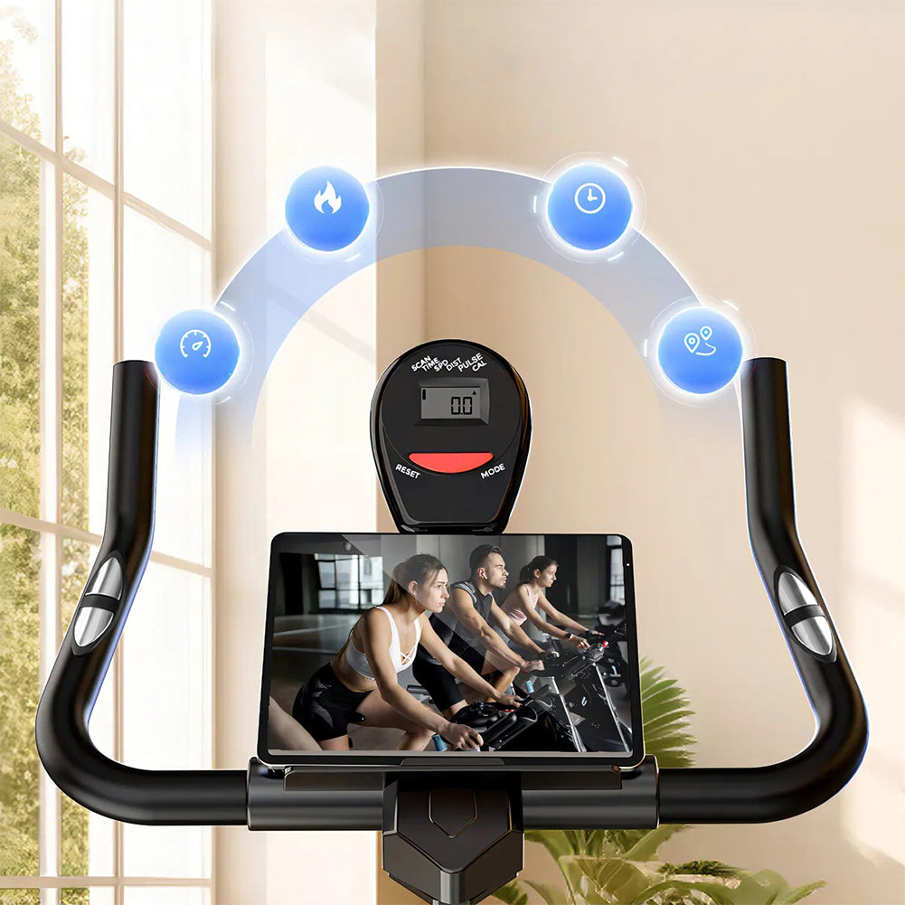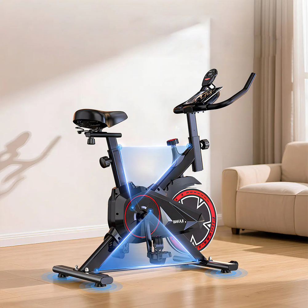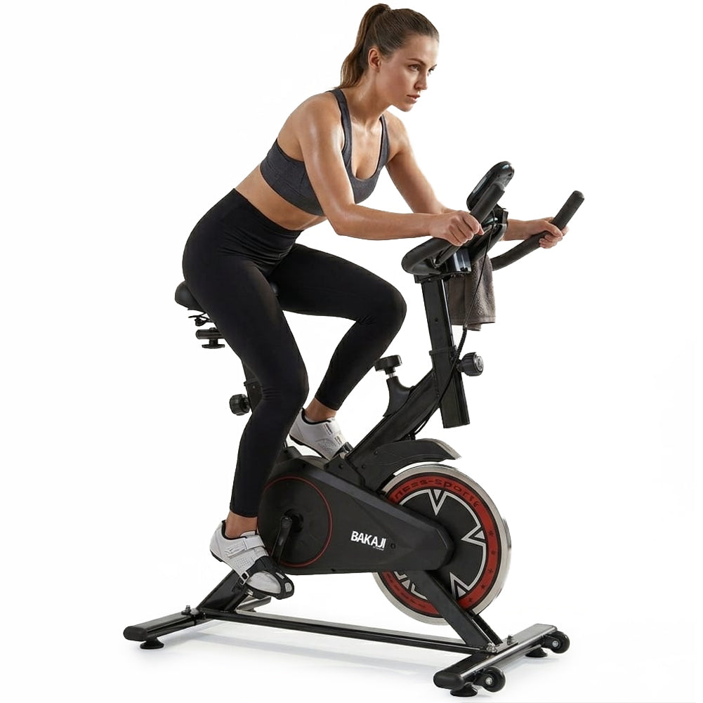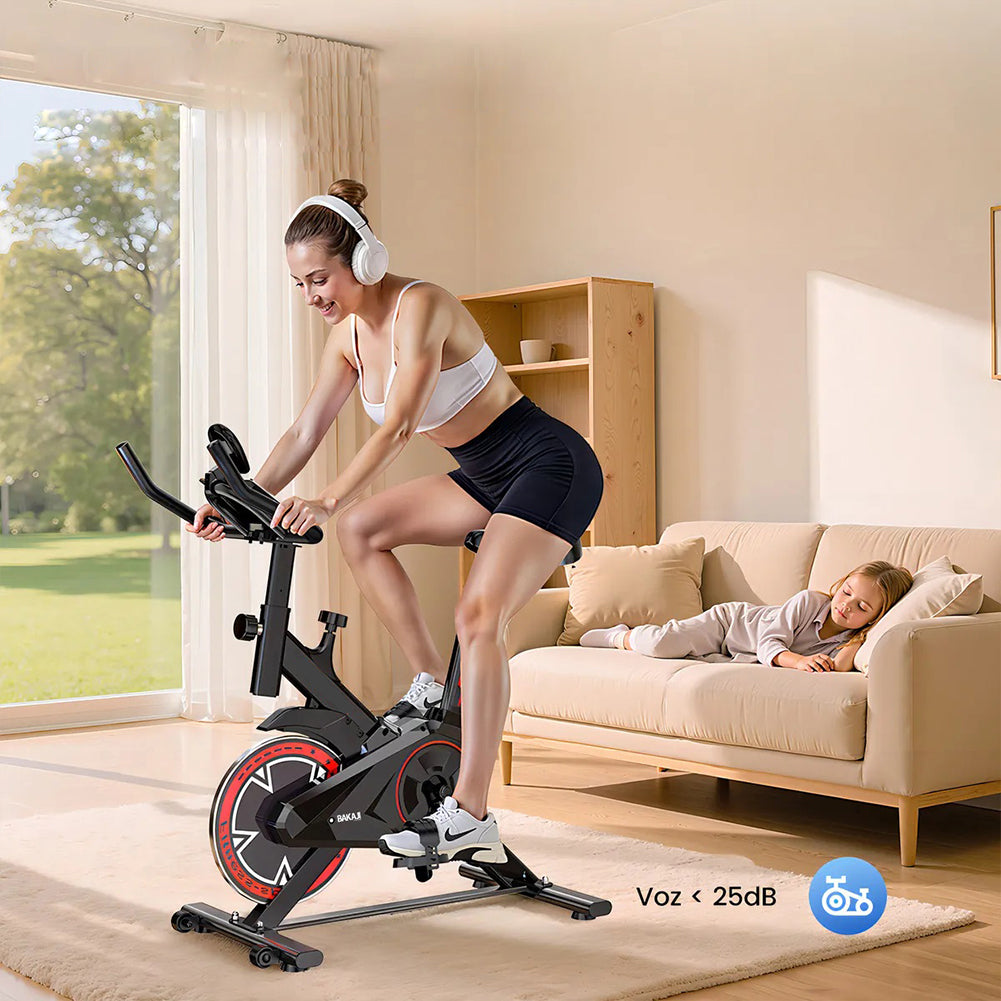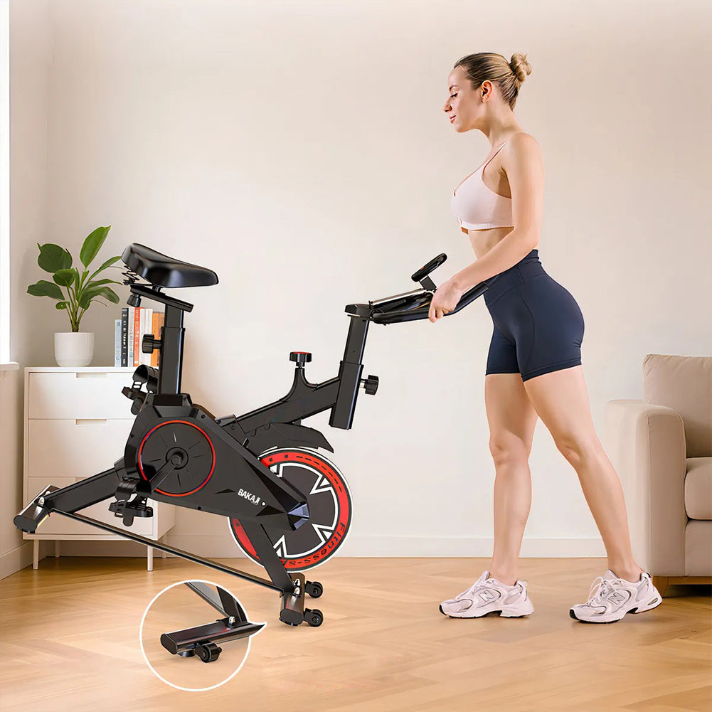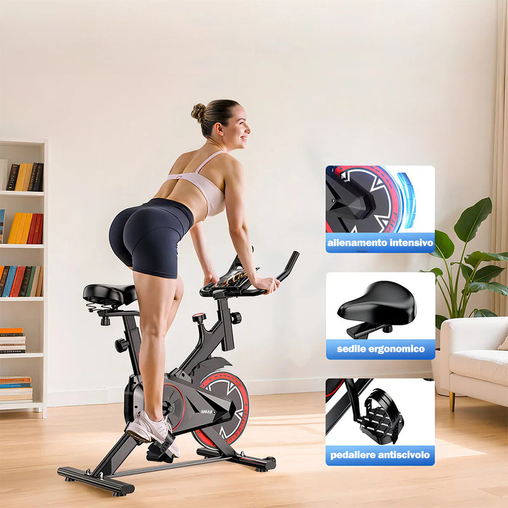 La spin bike Bakaji offre un’esperienza di allenamento realistica grazie al sistema di resistenza manuale che simula percorsi su strada con variazioni di intensità.