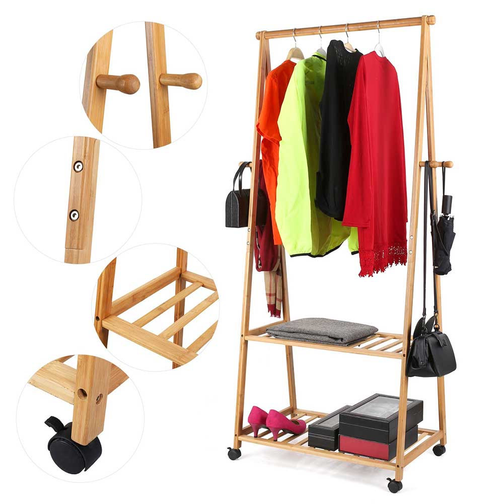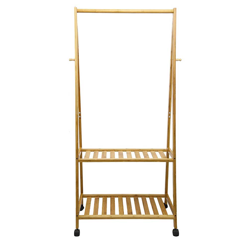 Stand Appendiabiti in Legno di Bambu 70x33x153cm Camera Letto Ruote 2 Ripiani
