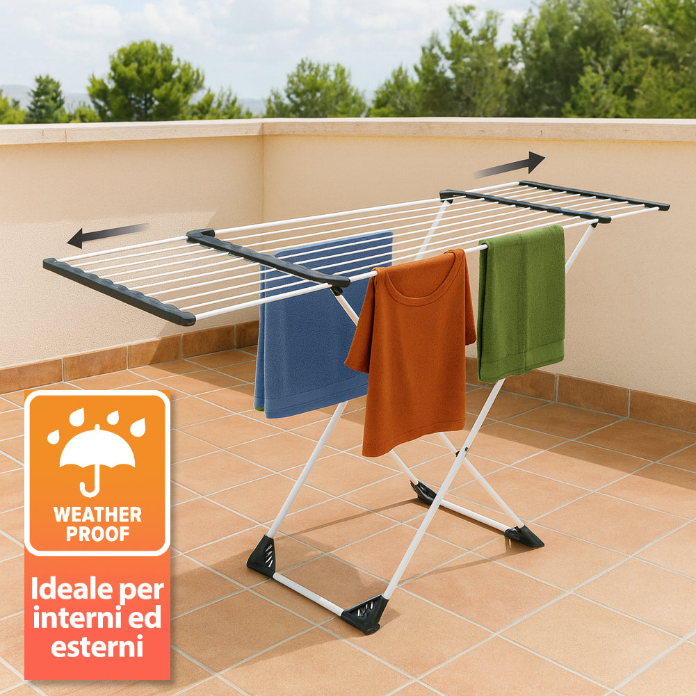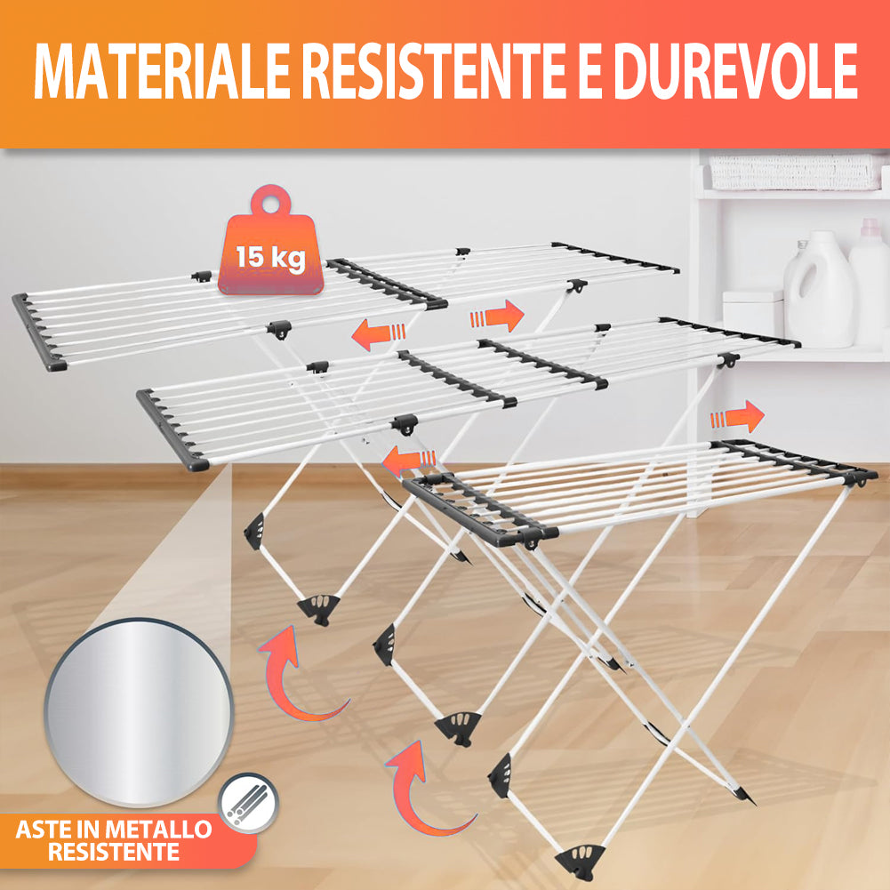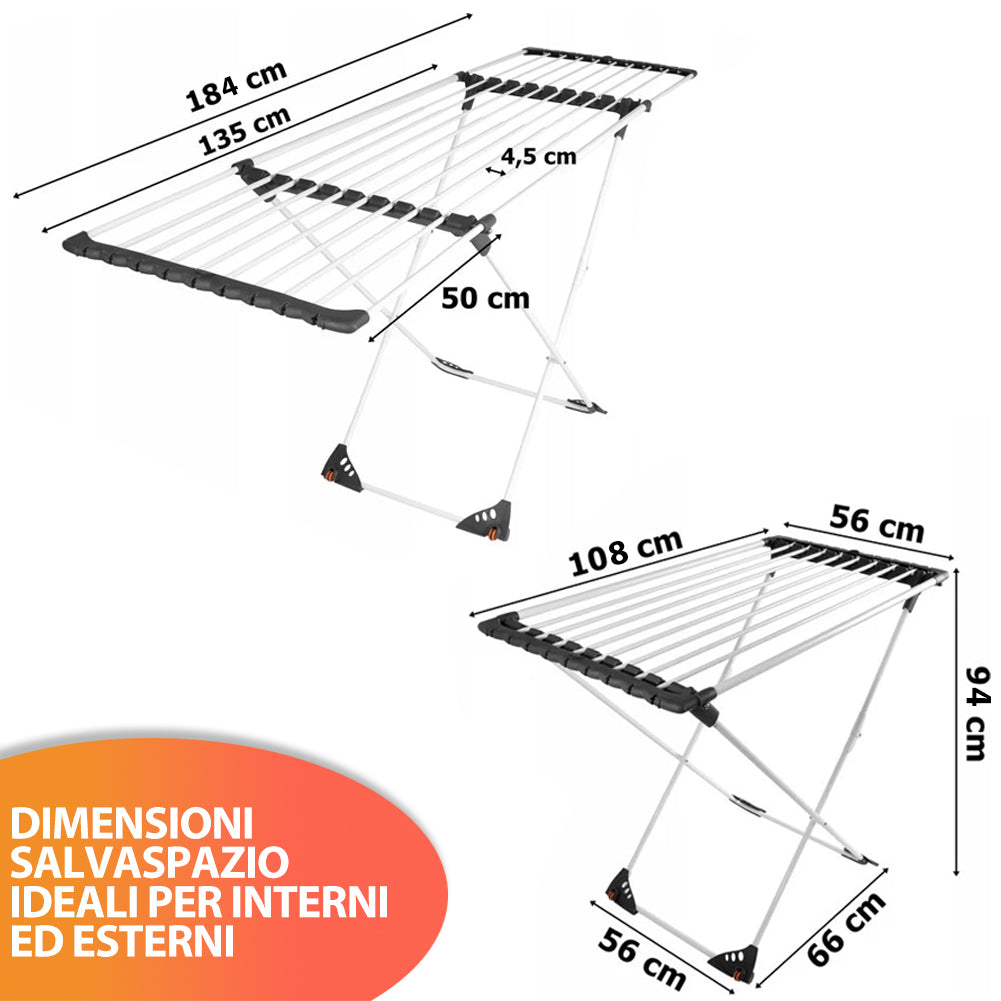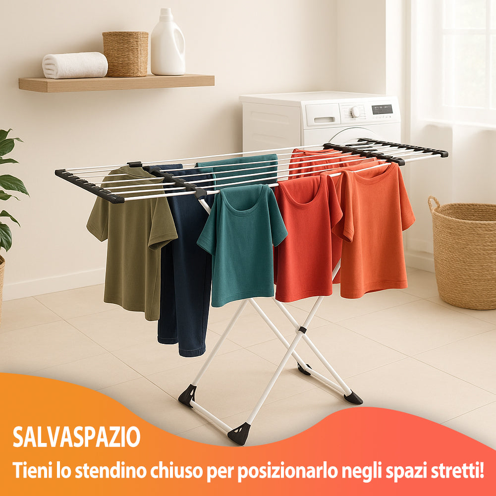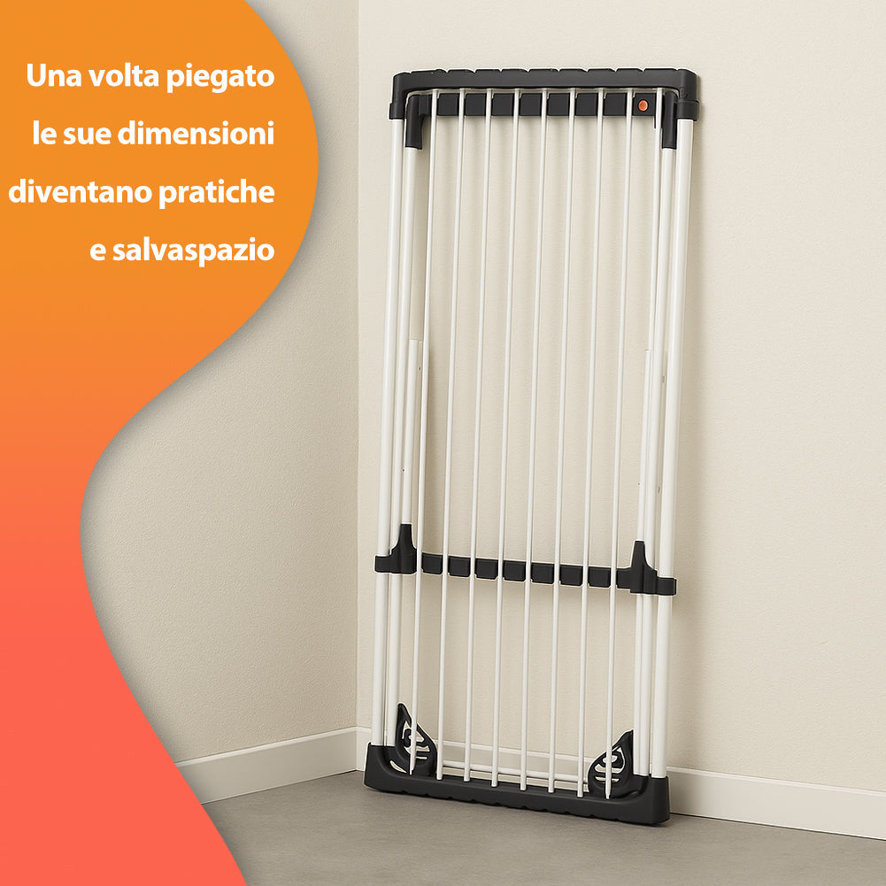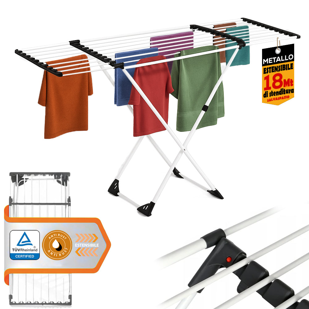 Grande capacità di stenditura ma anche una soluzione salvaspazio, con i suoi 18 metri di stenditura distribuiti su barre in metallo verniciato, offre ampio spazio per asciugare indumenti, asciugamani e lenzuola.