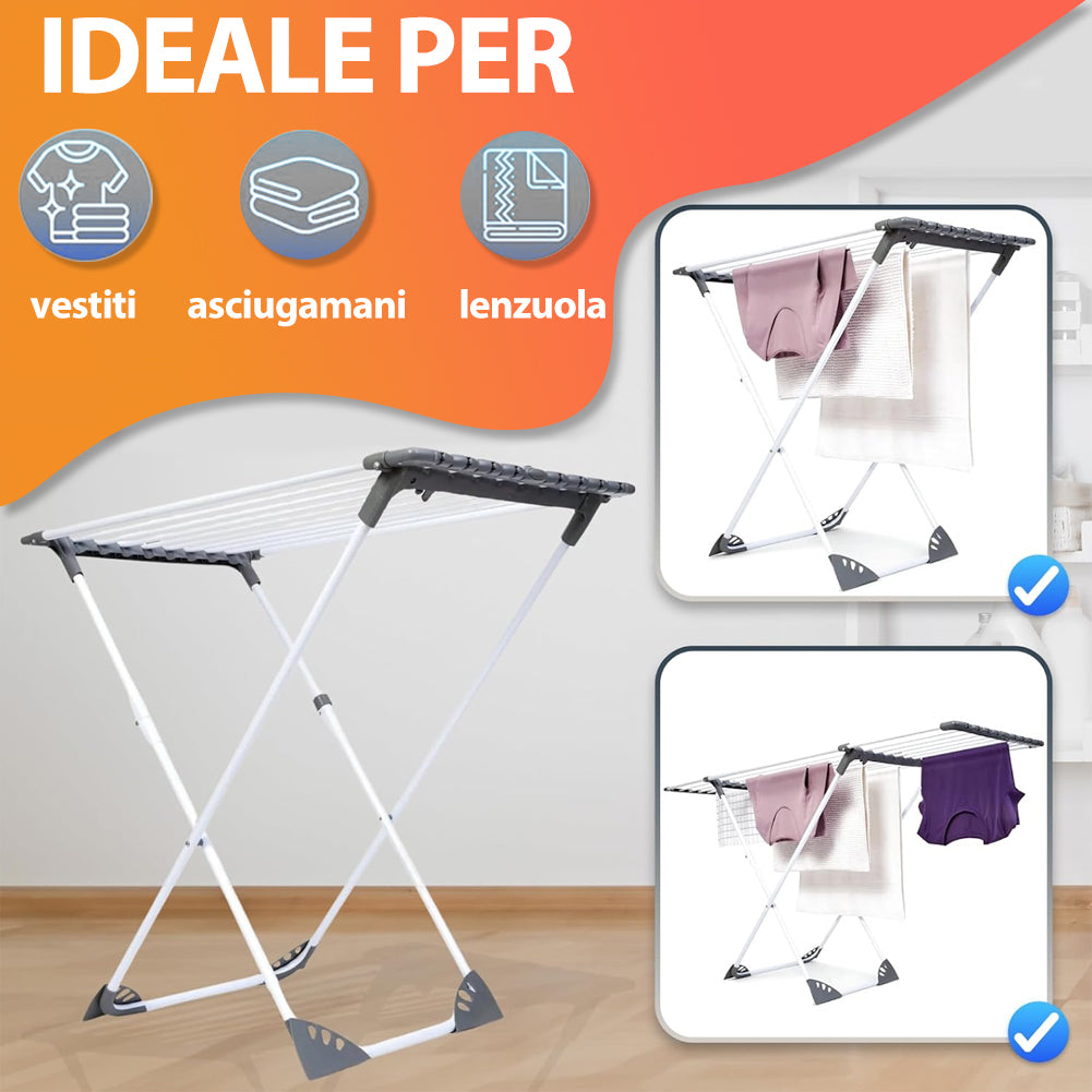 Design pieghevole e salvaspazio, una volta terminato l’uso, lo stendino si chiude facilmente diventando compatto e semplice da riporre.