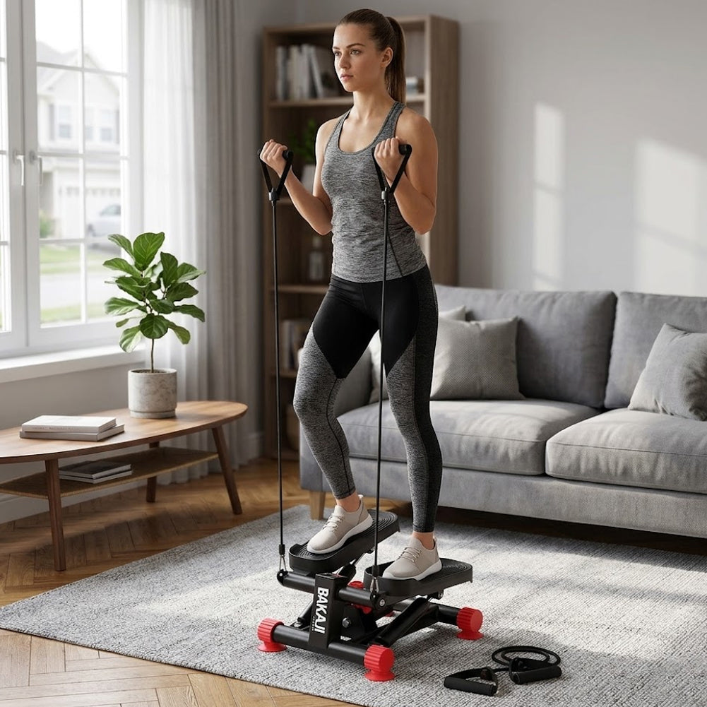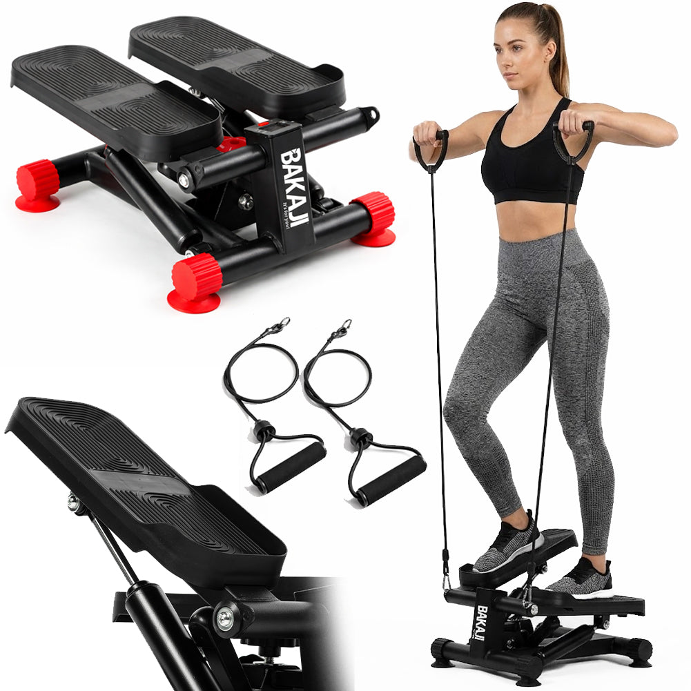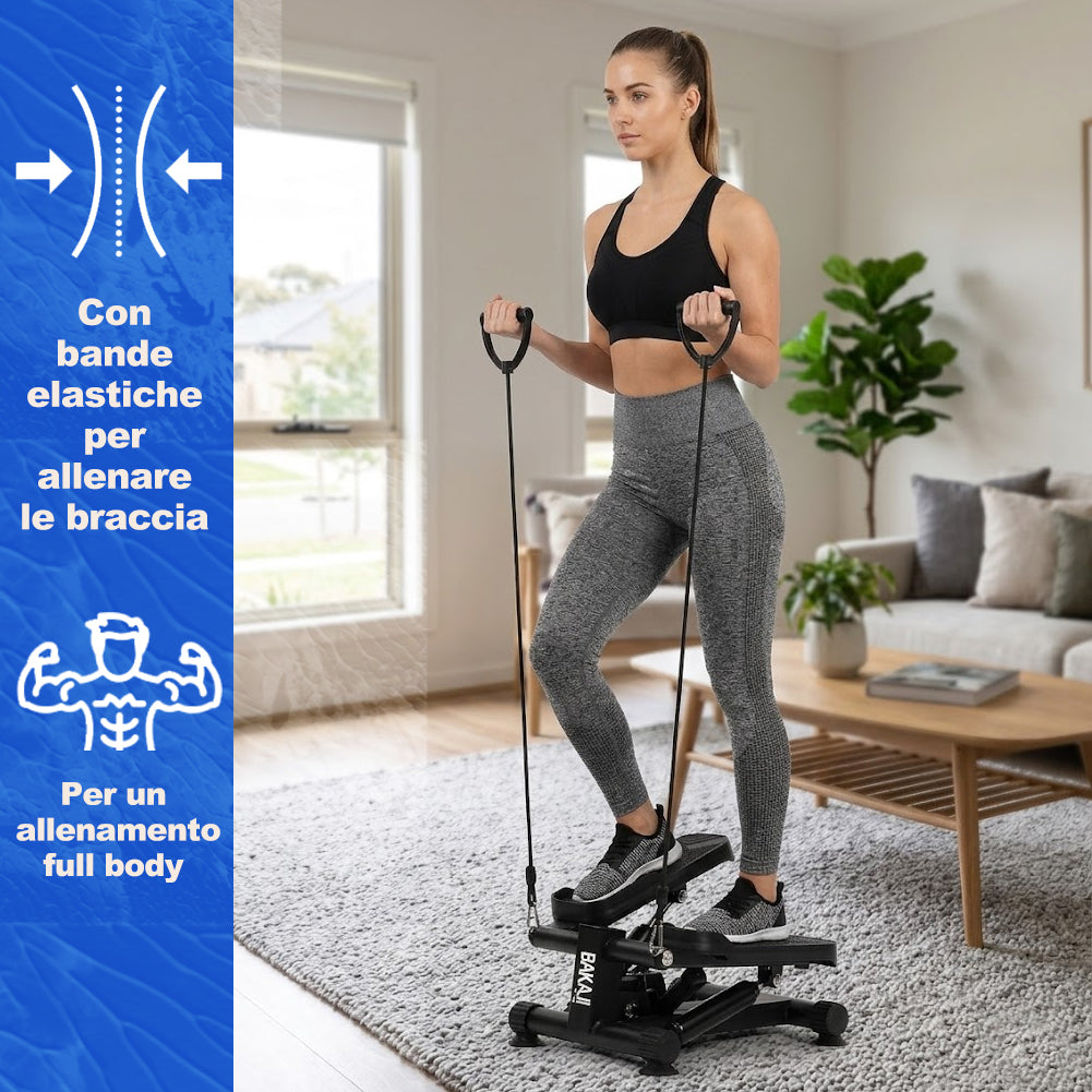 Il mini stepper simula la salita delle scale coinvolgendo glutei, quadricipiti, polpacci e core, mentre le bande elastiche integrate permettono di allenare anche braccia, spalle e schiena.