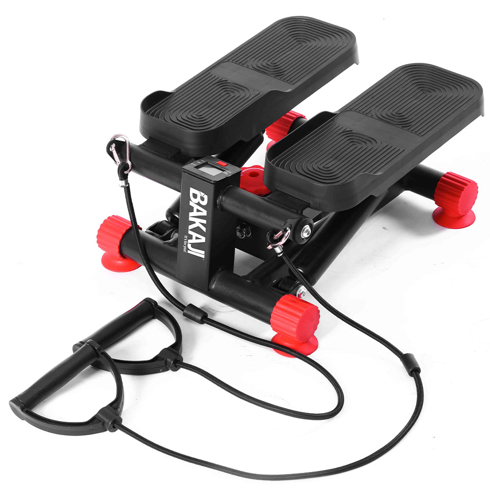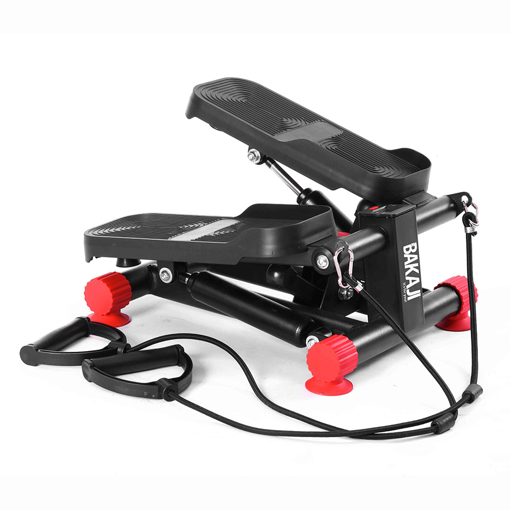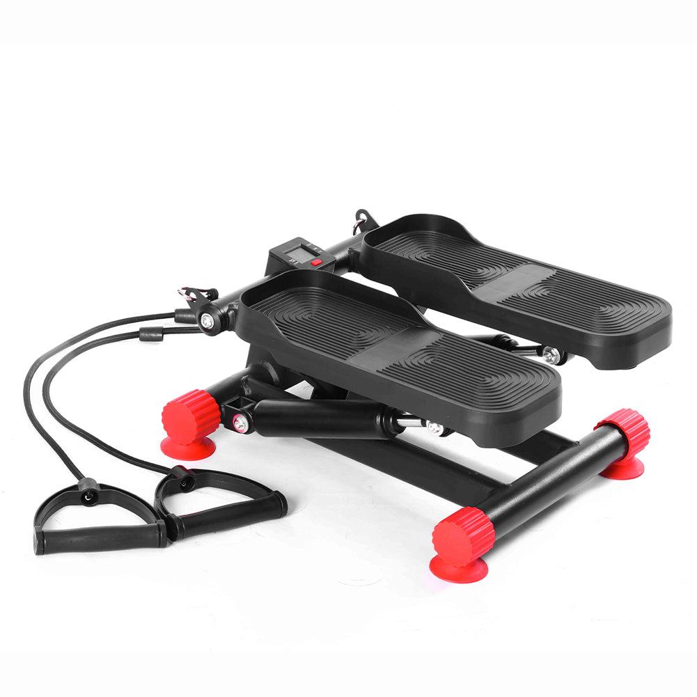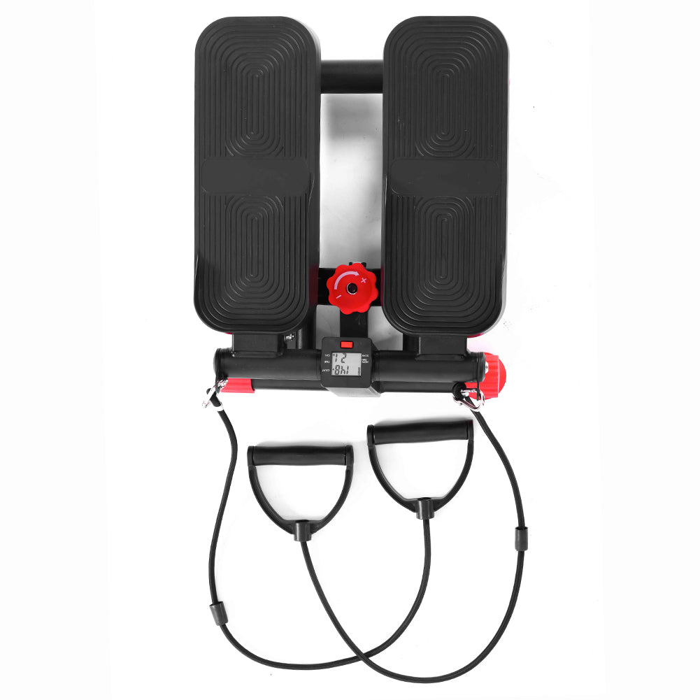 Il mini stepper simula la salita delle scale coinvolgendo glutei, quadricipiti, polpacci e core, mentre le bande elastiche integrate permettono di allenare anche braccia, spalle e schiena.