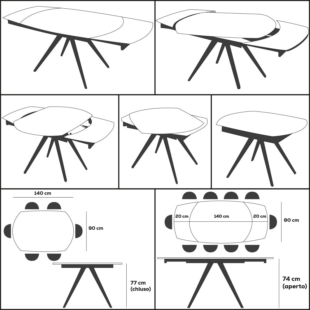 Il tavolo chiuso misura 140 cm ma si estende fino a 180 cm grazie a due pratici moduli girevoli da 20 cm ciascuno.