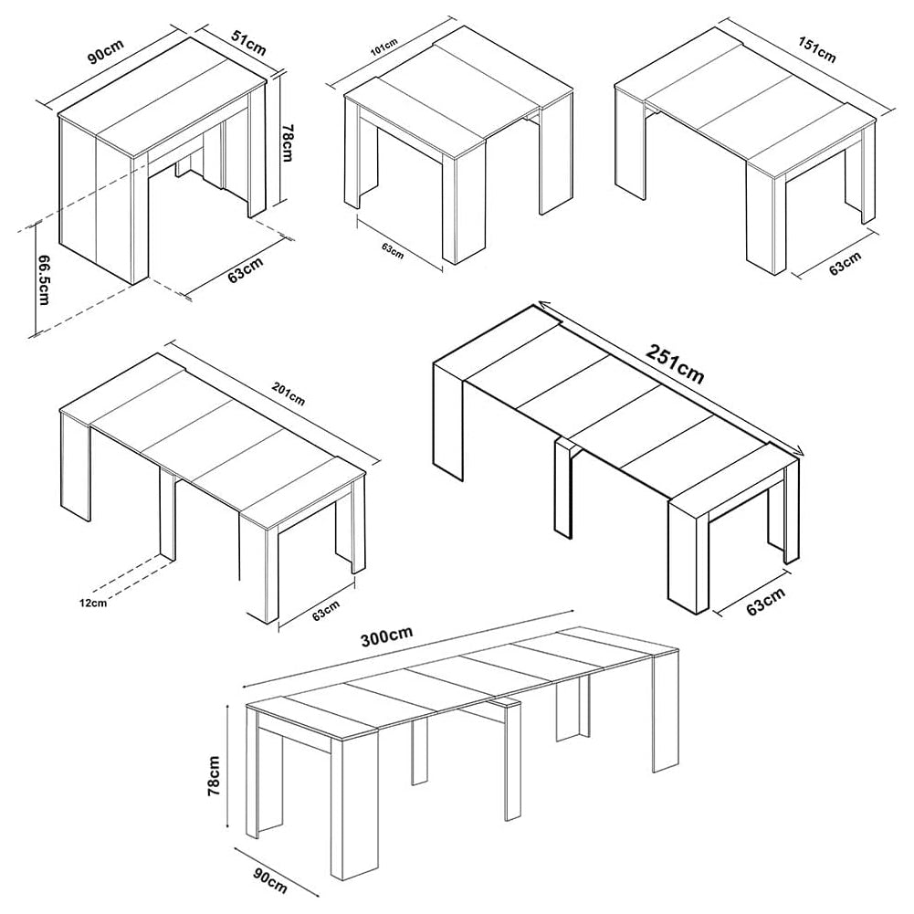 Questo fantastico tavolo si presenta come un normalissima consolle, ma basterà aprire i 2 piani d'appoggio posizionati sui lati della struttura per trasformare quest'ultimo in un bellissimo tavolo da pranzo fino a 3 metri di lunghezza.