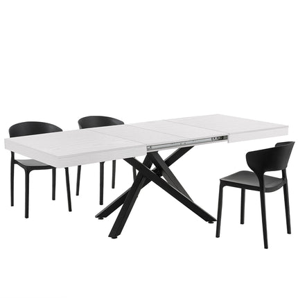Sistema di apertura a scorrimento con due tegole aggiuntive: Questo tavolo estendibile in legno offre una straordinaria flessibilità grazie al suo sistema di apertura a scorrimento, che consente di aggiungere due tegole di legno da 90 x 40 cm ciascuna. Questo permette di estendere la lunghezza del tavolo da 140 cm a 220 cm, rendendolo perfetto per ospitare più persone o per attività che richiedono un ampio spazio di lavoro. Le tegole si inseriscono facilmente nel piano del tavolo, garantendo una superficie uniforme e stabile.