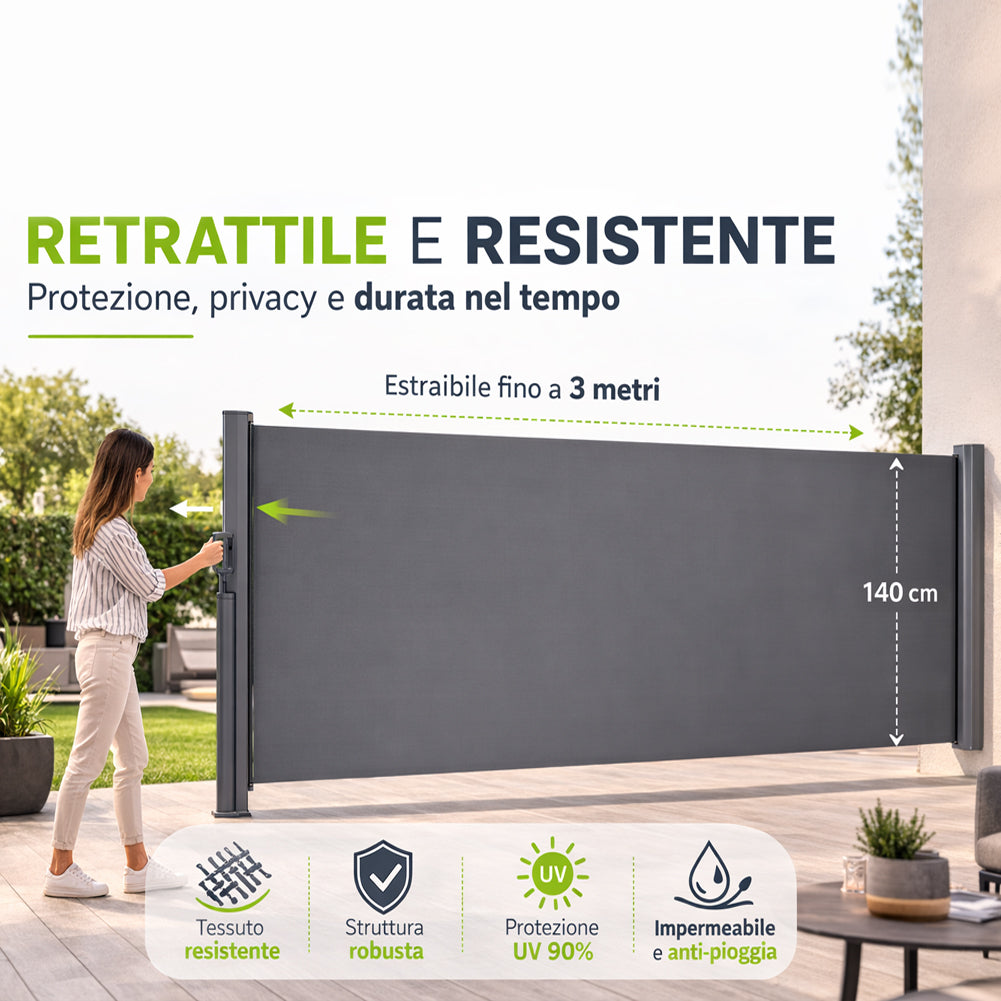 Il telo frangivista BAKAJI è fornita di 2 pali di supporto entrambi realizzati in metallo di altissima qualità, il primo funge da staffa di fissaggio al muro ed è caratterizzato da un particolare meccanismo retrattile in alluminio che permette di riavvolgere il telone al suo interno ogni qualvolta non è utilizzato, il secondo palo invece funge da fermo per quest'ultimo quando in uso, inoltre tramite l'apposita maniglia potrai chiudere e riaprire la tenda con il massimo della facilità .