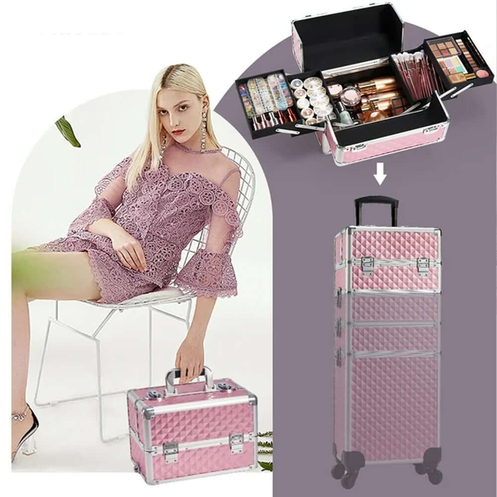 Trolley Makeup 4in1 Valigetta Rosa Trucco Estetista Beauty Case Ruote Staccabili