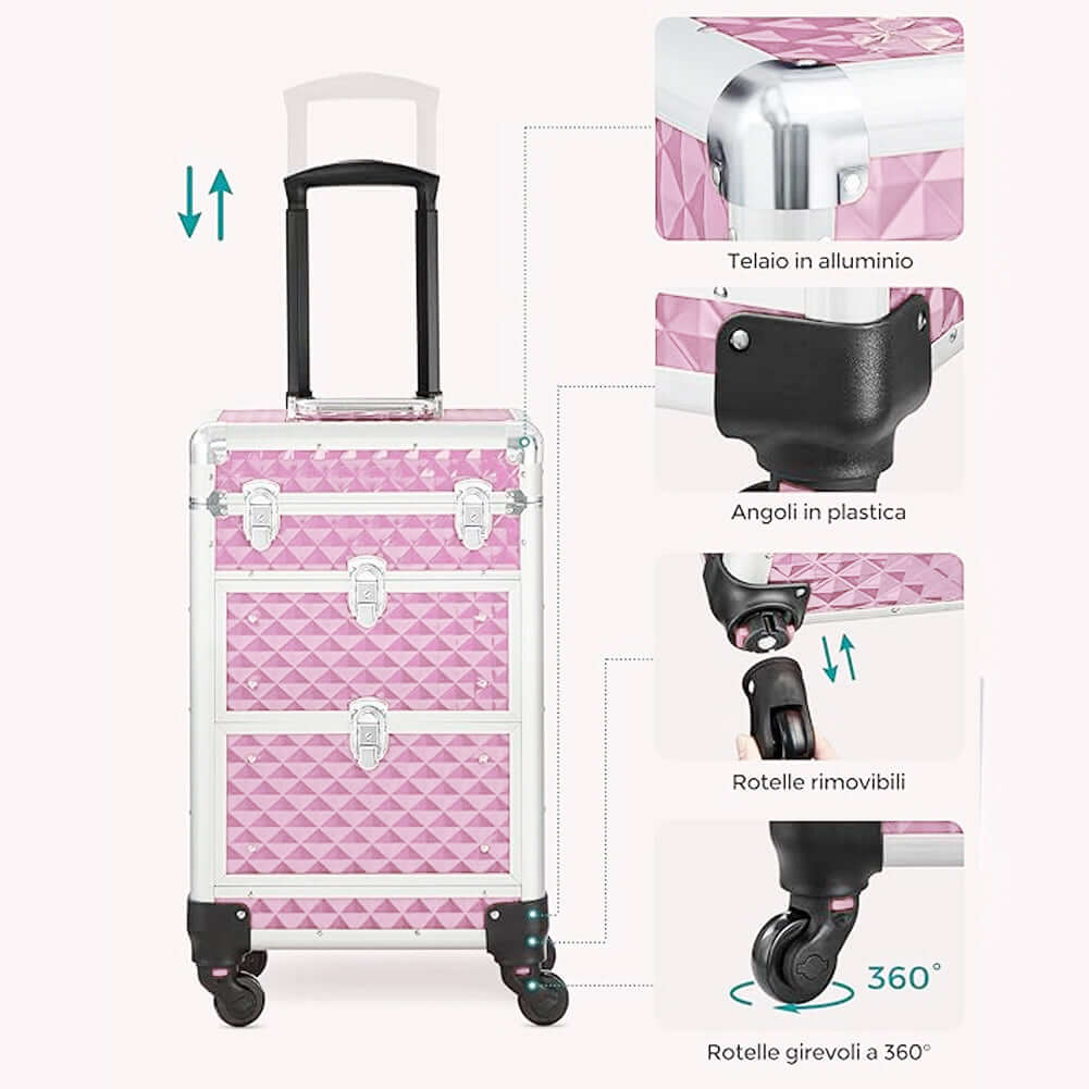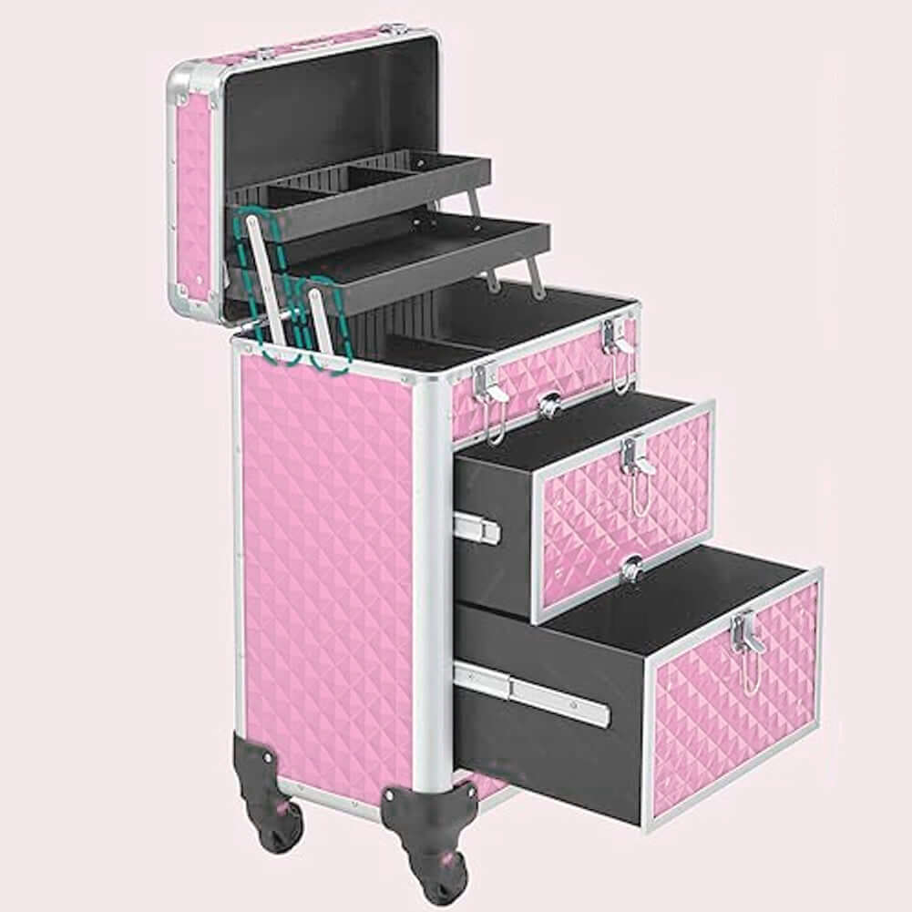 Il trolley per trucco con rotelle è realizzato in resistente alluminio, garantendo ai tuoi effetti personali rimangano al sicuro durante il viaggio.
